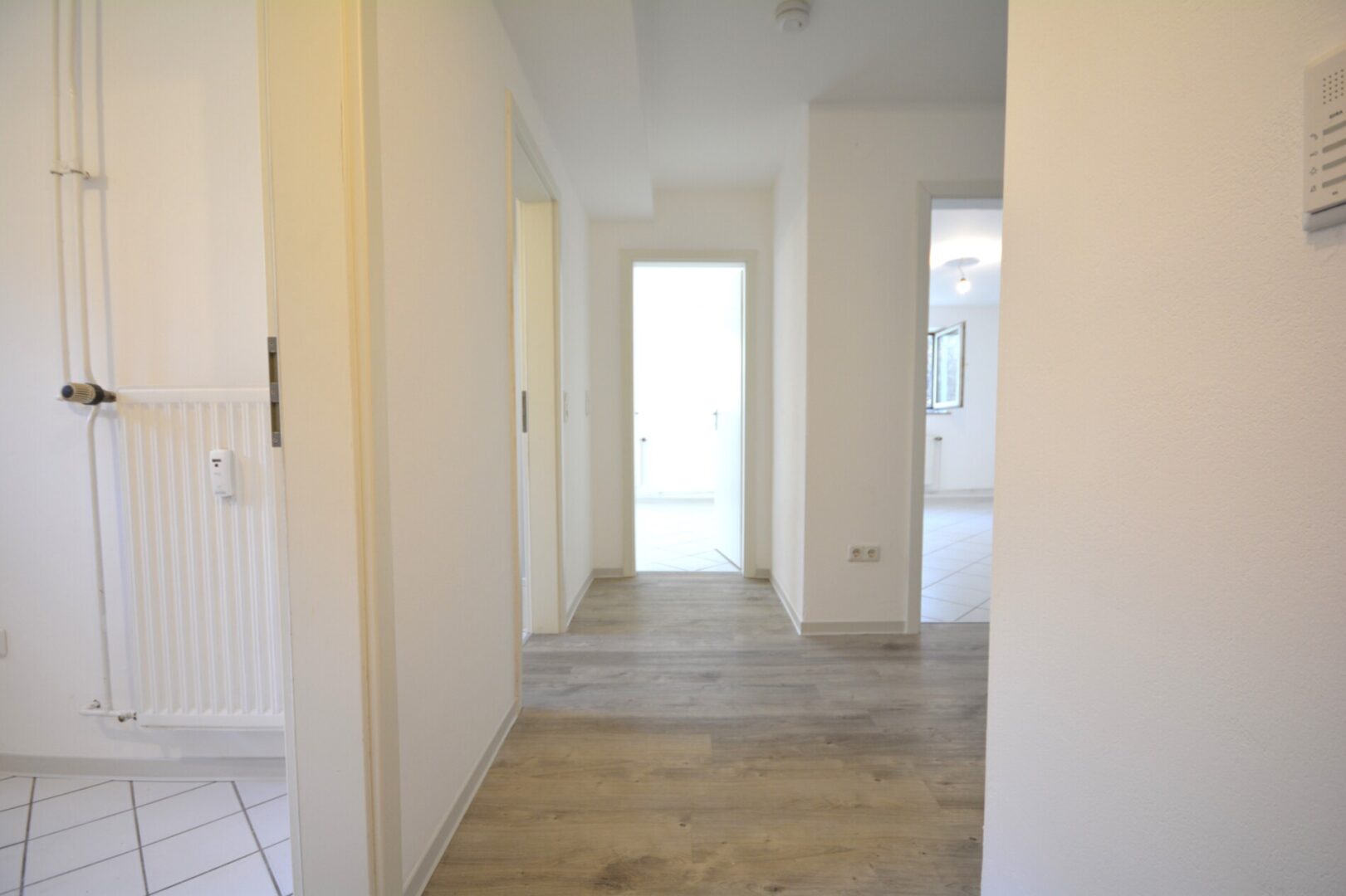 Als Bodenbeläge wurden pflegeleichte helle Fliesen sowie moderner Vinylboden in Holzoptik gewählt, die der Wohnung eine zeitlose und freundliche Ausstrahlung verleihen. Sämtliche Wände sind frisch weiß gestrichen und unterstreichen den gepflegten Gesamteindruck.