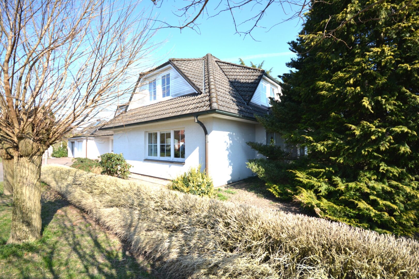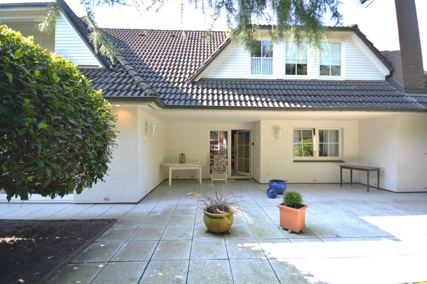 Der liebevoll gestaltete Garten überzeugt mit seinen üppigen Hortensien und duftenden Rosenstöcken, die das Auge erfreuen und einen Hauch von Romantik versprühen. Die überdachte Terrasse, bietet Ihnen einen geschützten Bereich im Freien, wo Sie in Ruhe sonnenreiche Tage genießen und den Alltag hinter sich lassen können