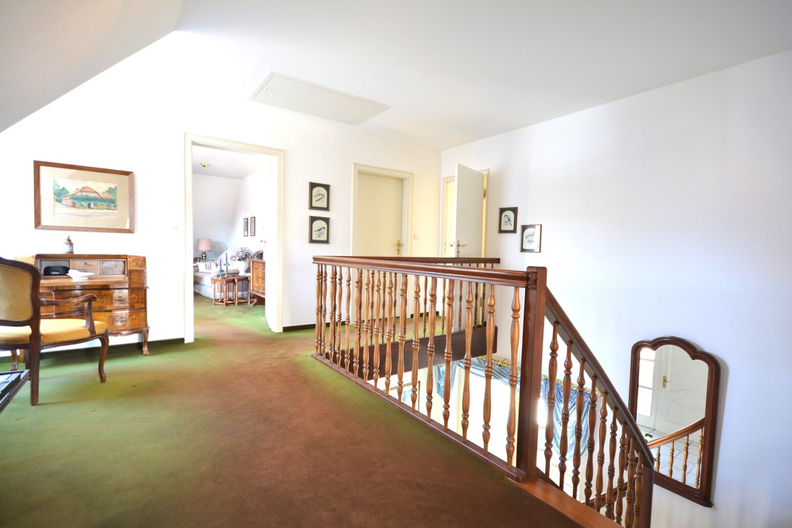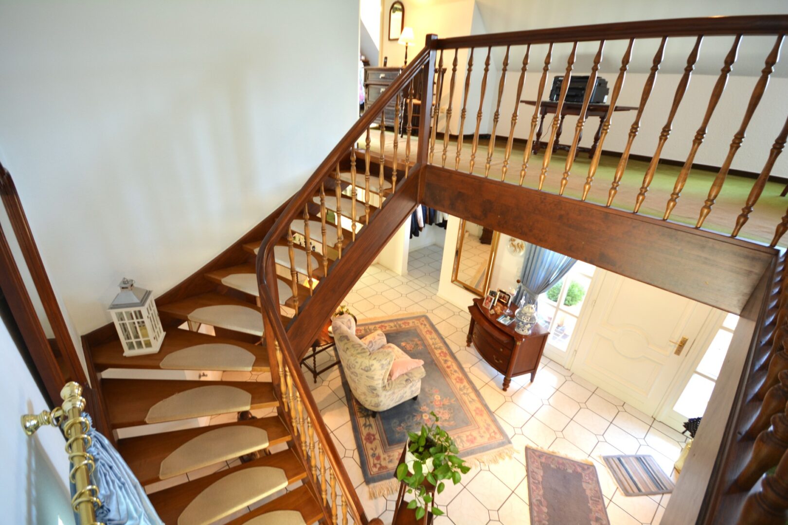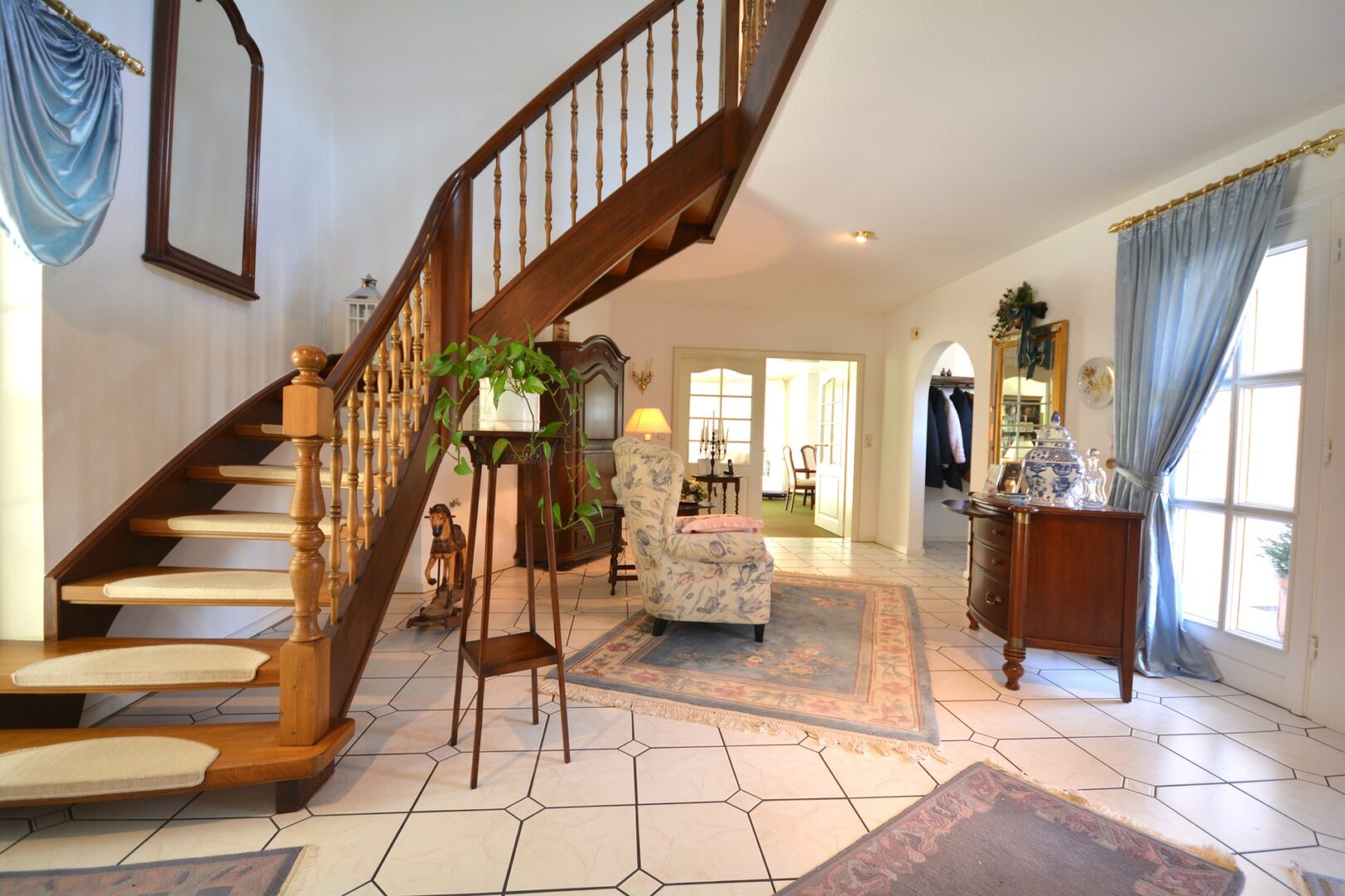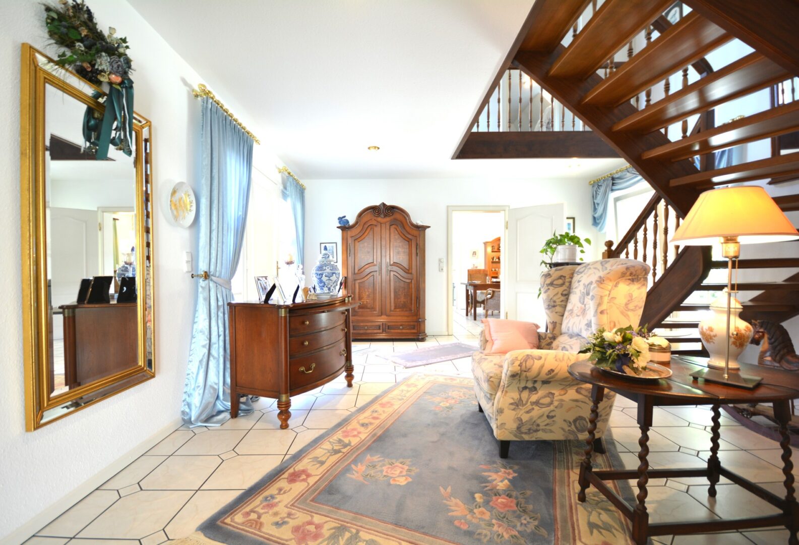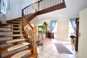 Schon der beeindruckende Eingangsbereich mit der geschwungenen, massiven Holztreppe in das obere Geschoss heißt Sie herzlich Willkommen.