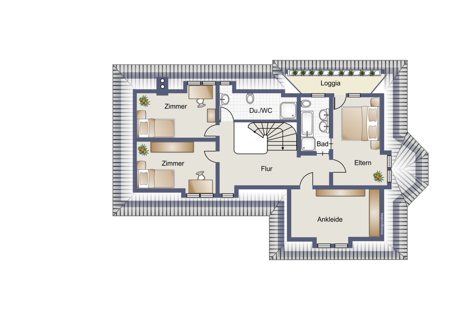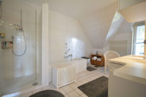 Das Dachgeschoss fungiert als Ihr persönlicher Rückzugsort, ausgestattet mit einem geräumigen Schlafzimmer, Bad en Suite und Loggia – hier können Sie den Tag entspannt bei morgentlichem Vogelgezwitscher und friedlicher Atmosphäre beginnen. Die weiteren Zimmer auf dieser Etage können flexibel als Kinder-/Gäste-/Ankleidezimmer genutzt werden. Praktisch: ein zweites Badezimmer!