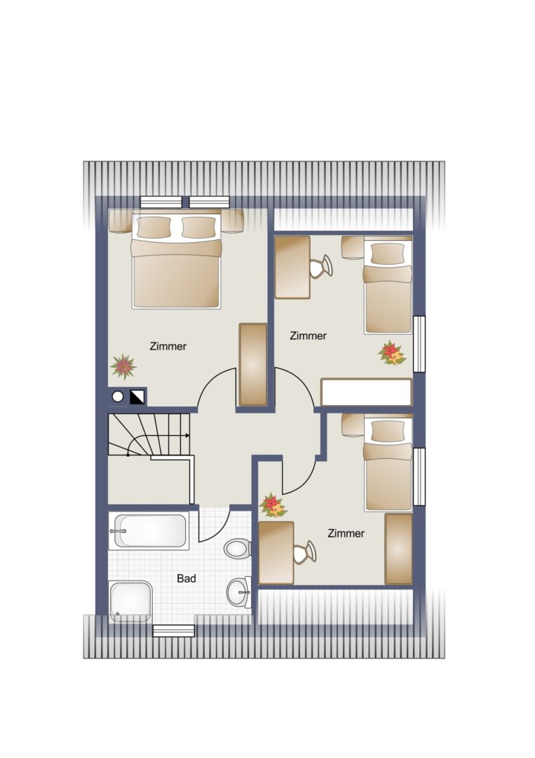 Im Dachgeschoss befinden sich drei gut geschnittene Schlafzimmer, die flexibel genutzt werden können – beispielsweise als Kinder-, Gäste- oder Arbeitszimmer. Das Badezimmer verfügt über eine Dusche und Badewanne und bietet damit sowohl Komfort als auch Entspannung. Der Spitzboden bietet zudem weiteres Ausbaupotenzial.