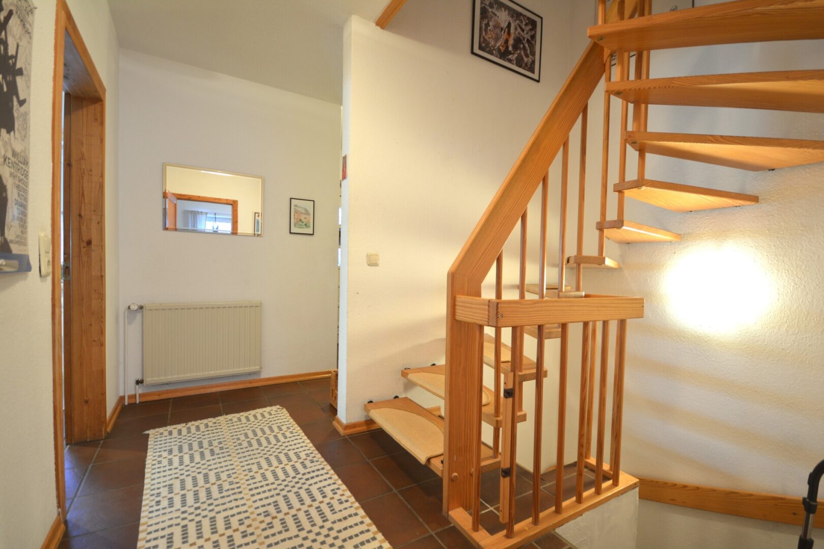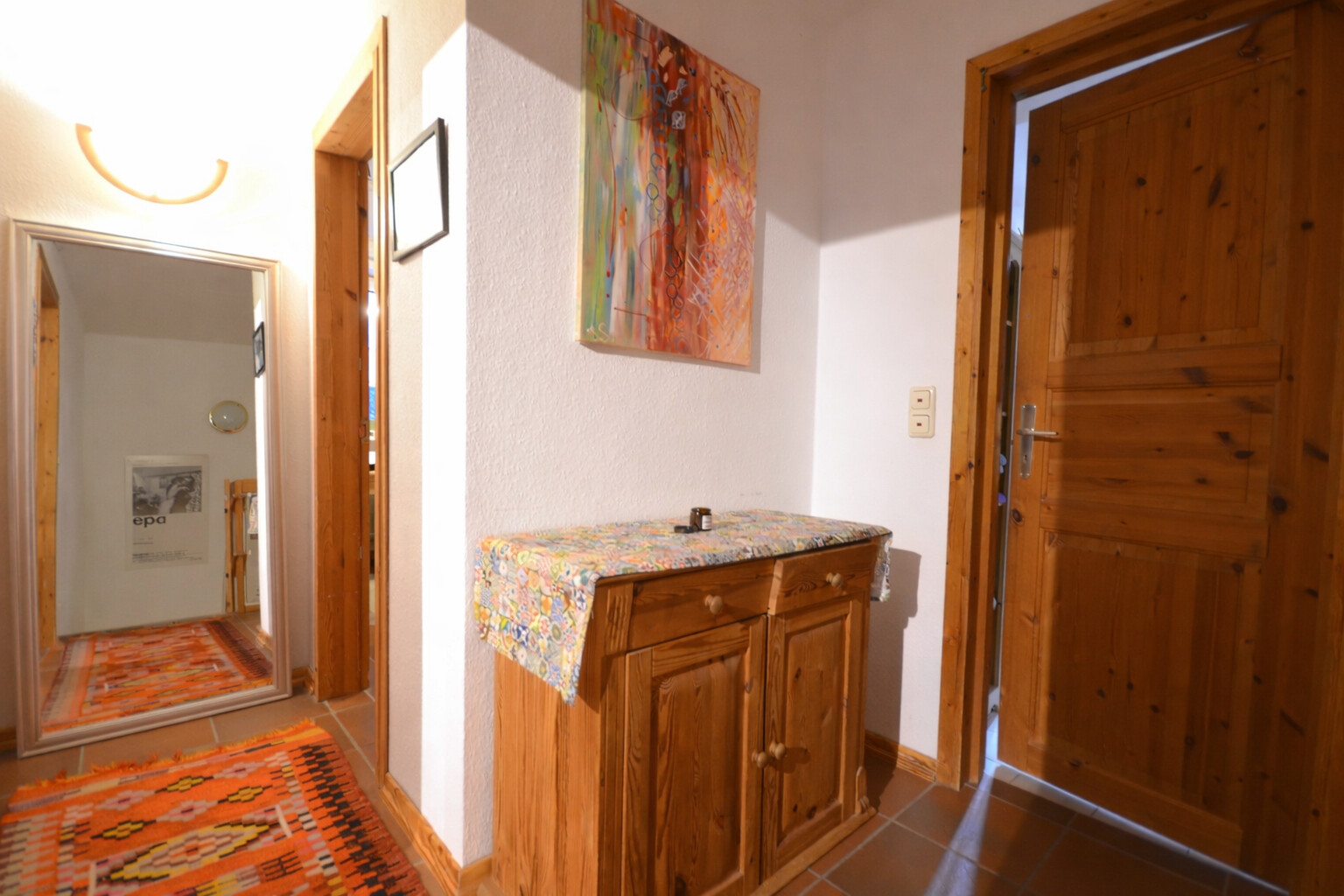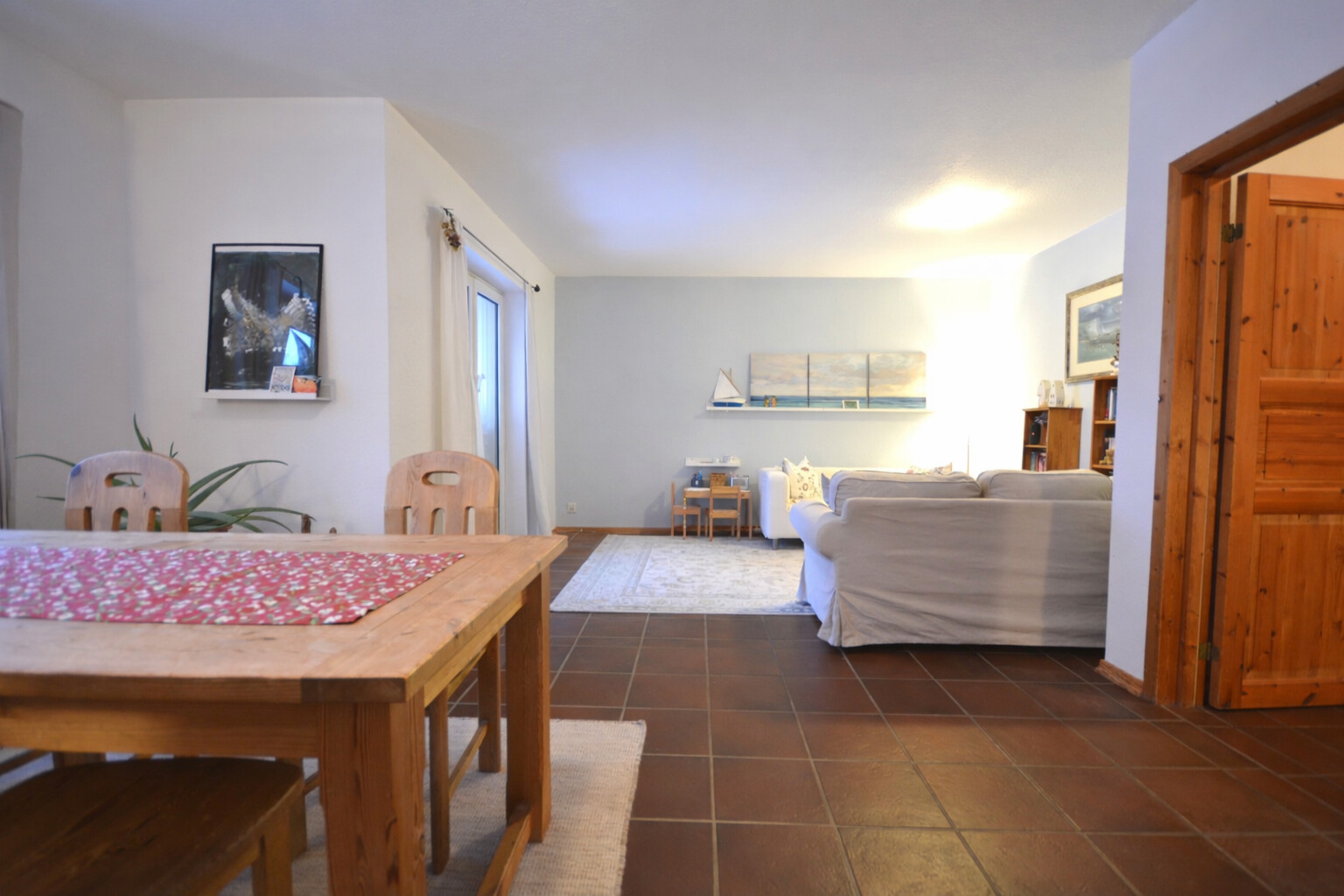 Der zentrale Treffpunkt des Hauses ist der gemütliche Wohn- und Essbereich mit rustikalen Bodenfliesen. Diese verleihen dem Raum eine behagliche Atmosphäre und laden zu geselligen Stunden mit Familie und Freunden ein.