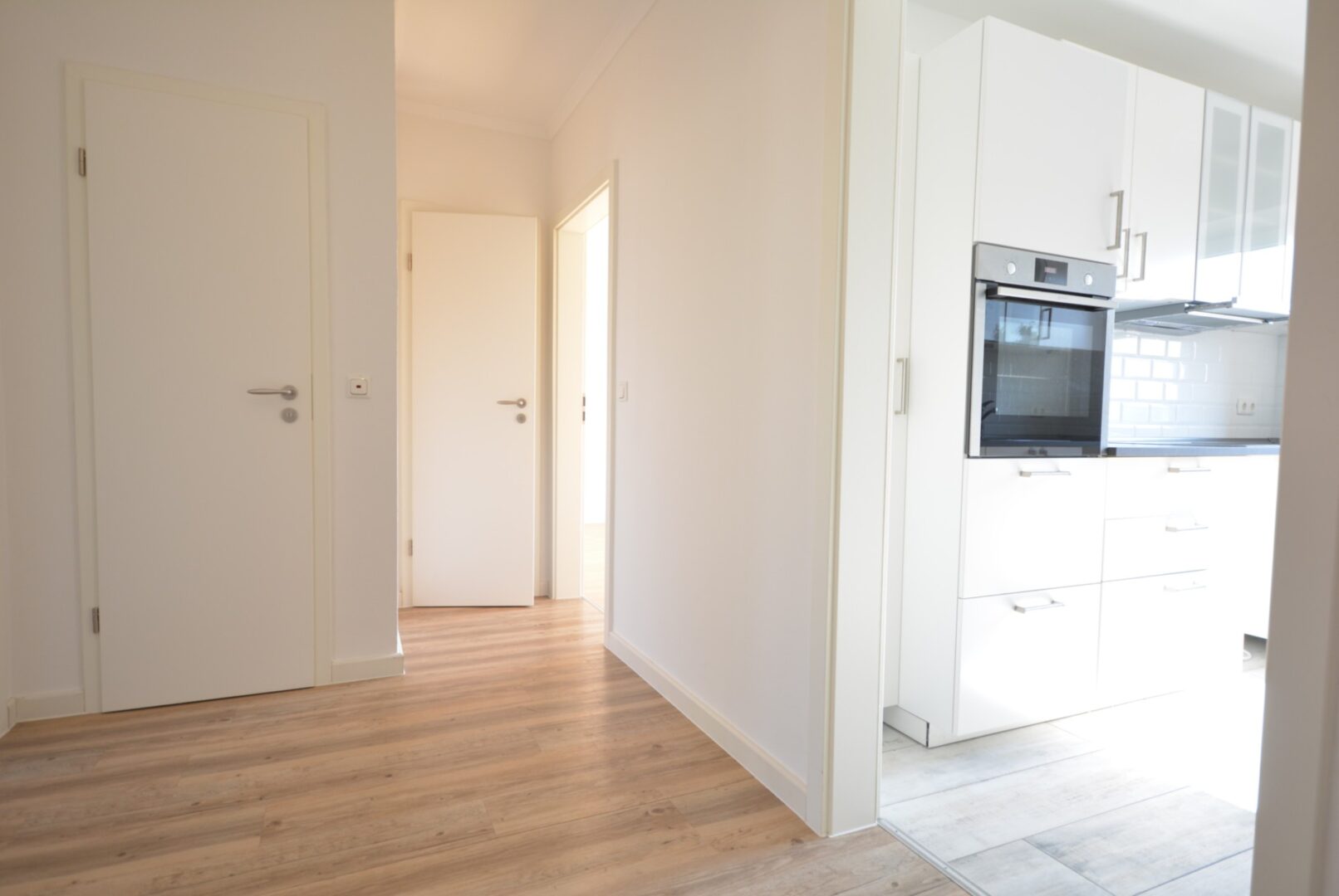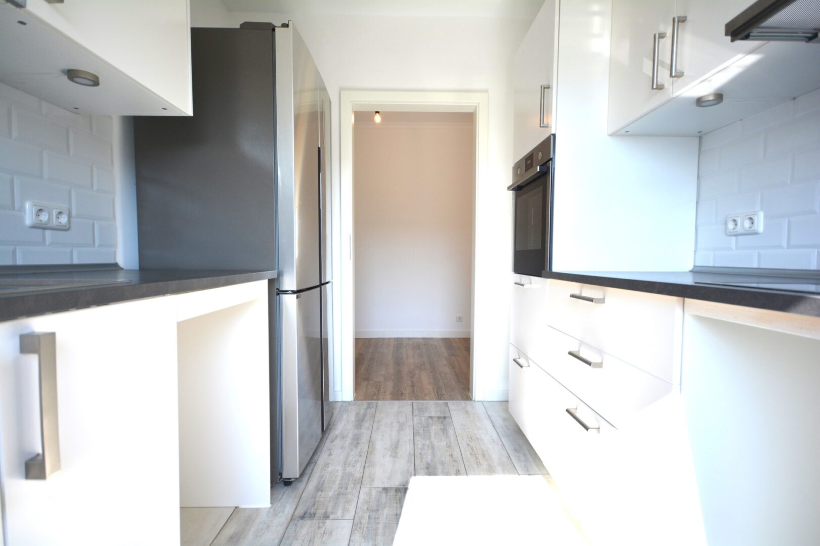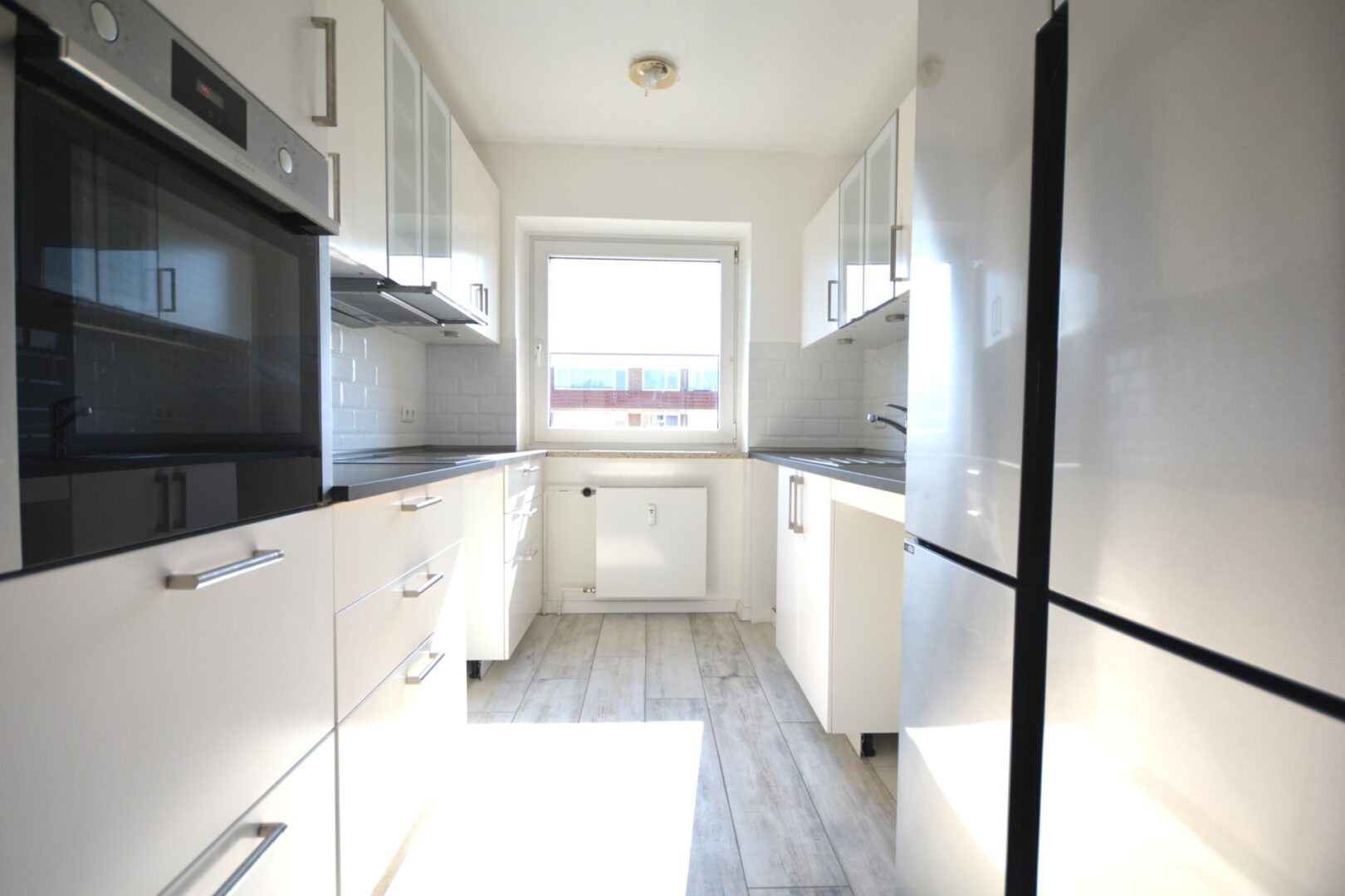 Die Küche ist mit einer modernen Einbauküche ausgestattet, inkl. Ceranfeld und Backofen (neuwertig, Marke Neff). Die Schrankfronten sind weiß inkl. Edelstahlgriffen und die Arbeitsfläche ist passend dazu in grau gehalten. Ebenfalls ist ein doppeltüriger, neuwertiger Kühl-/Gefrierschrank vorhanden.
