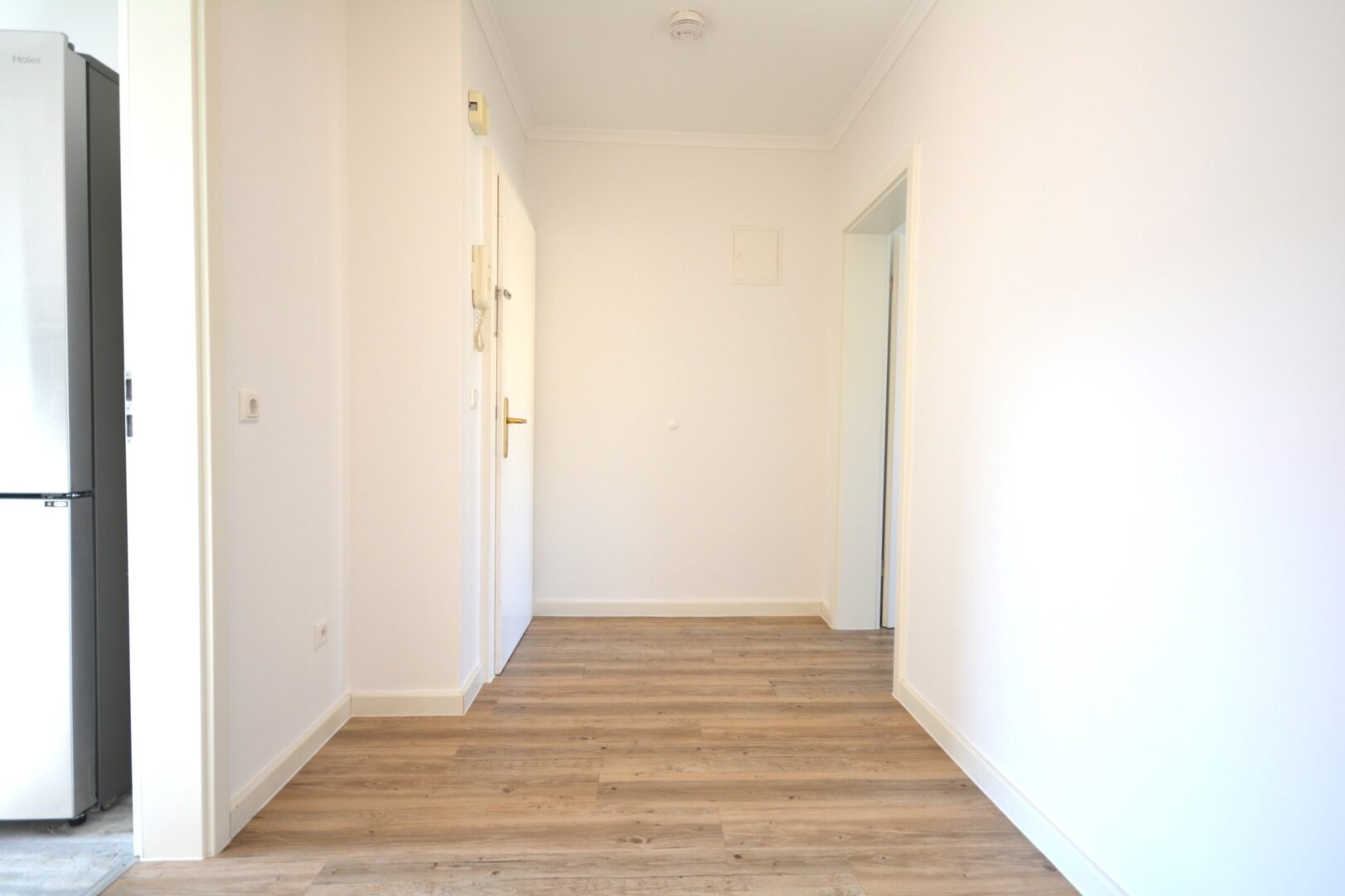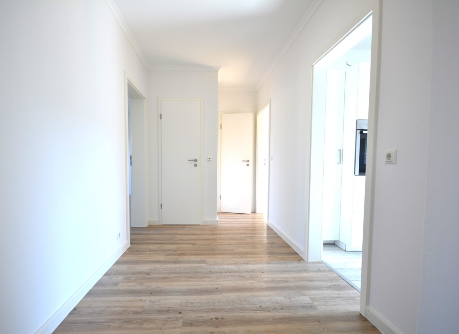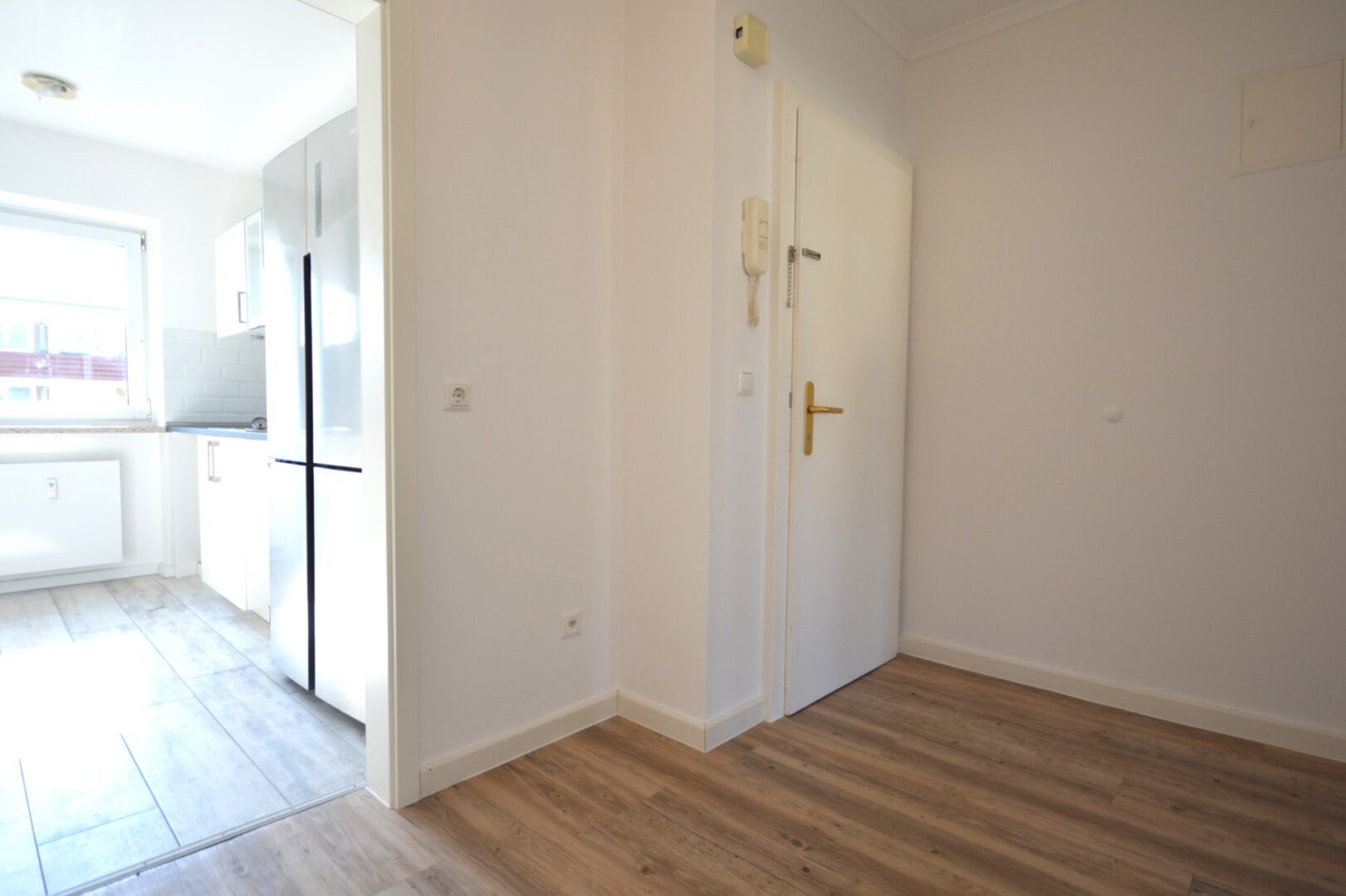 Die Küche ist mit einer modernen Einbauküche ausgestattet, inkl. Ceranfeld und Backofen (neuwertig, Marke Neff). Die Schrankfronten sind weiß inkl. Edelstahlgriffen und die Arbeitsfläche ist passend dazu in grau gehalten. Ebenfalls ist ein doppeltüriger, neuwertiger Kühl-/Gefrierschrank vorhanden.