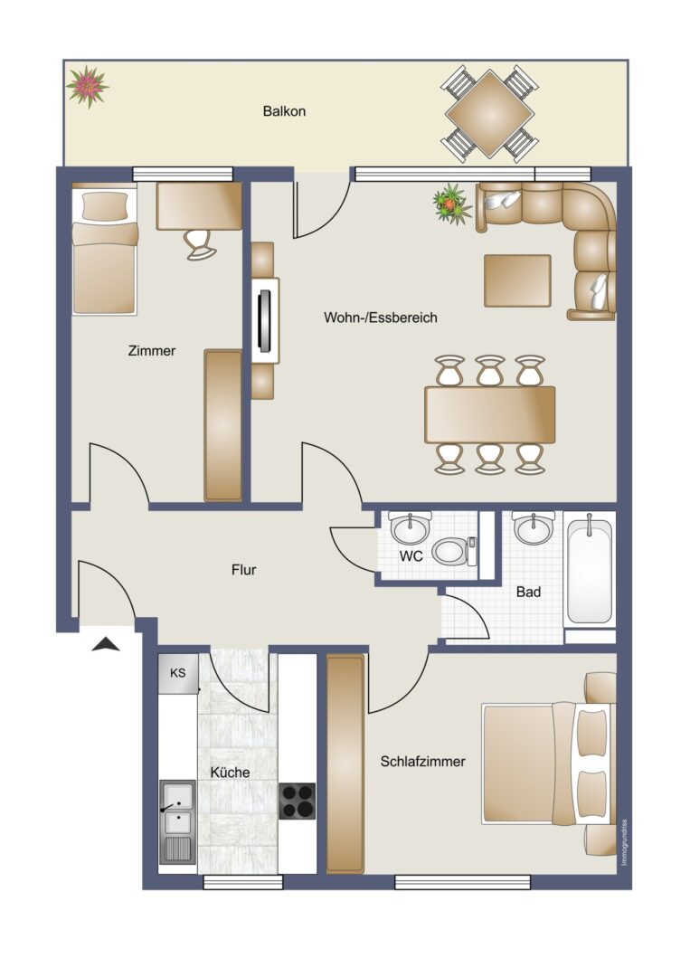 Die Wohnung verfügt über insgesamt 3 Zimmer, darunter 2 Schlafzimmer und ein großzügig geschnittenes Wohnzimmer, ein Esstisch passt hier ebenfalls noch gut hinein. Ein Highlight ist der große Balkon auf ganzer Wohnungsbreite, hier können Sie an warmen Tagen die frische Luft genießen & entspannen. Ein größerer Baum bietet Ihnen hier prima Sichtschutz.