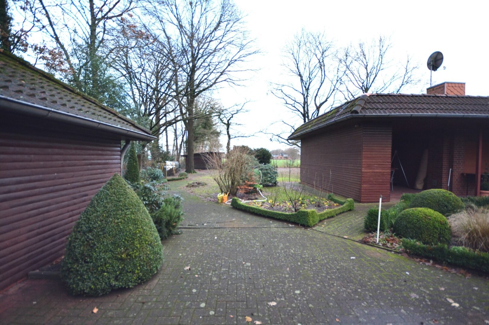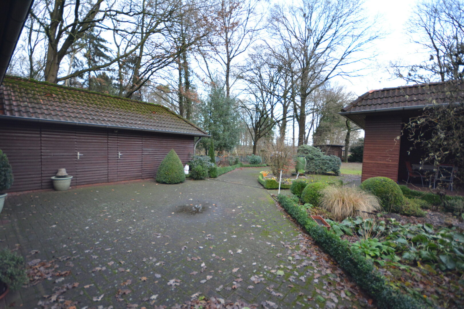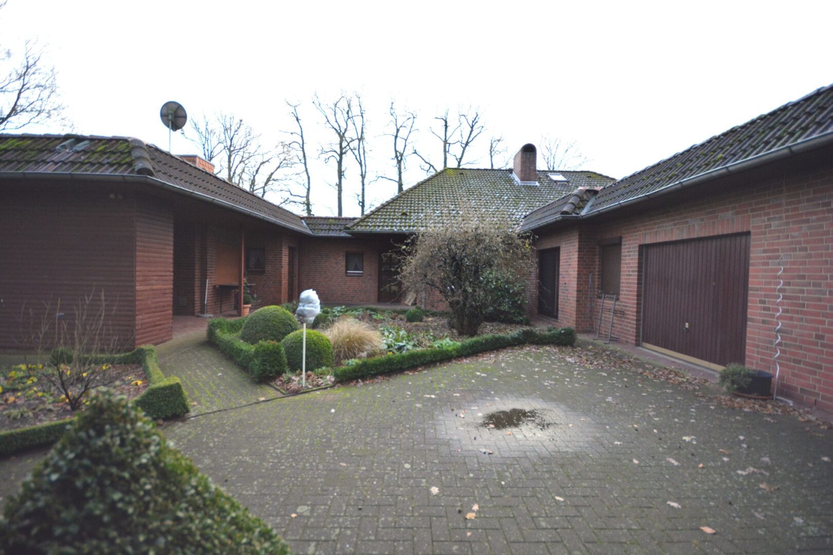 Ein besonderer Treffpunkt auf dem Anwesen ist der einladende Innenhof. Dieser geschützte Bereich schafft eine private und entspannte Atmosphäre – perfekt als grüne Oase der Ruhe.